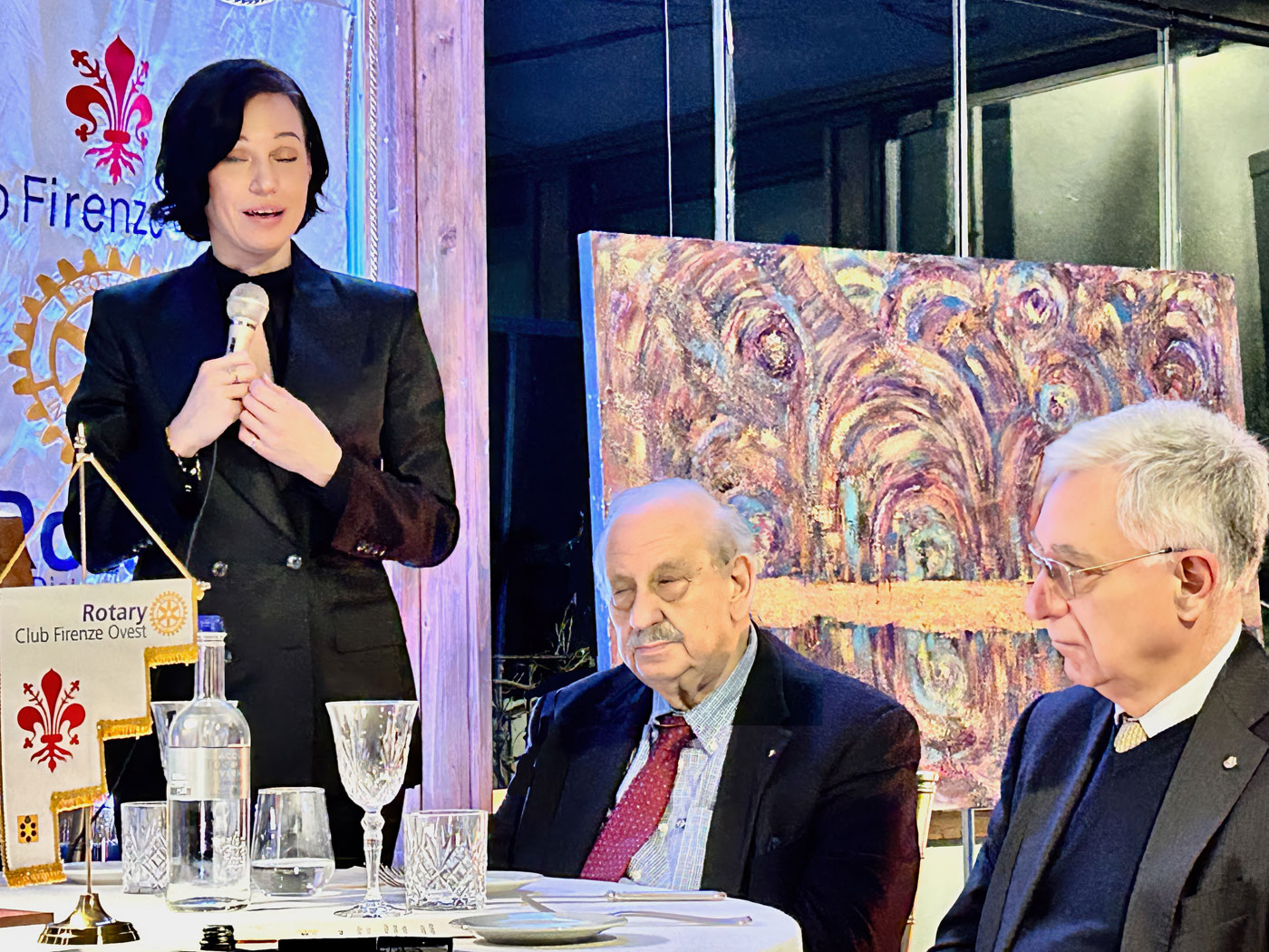 Al tavolo della presidenza, Sandro Fusari presenta i due relatori Teo Cavallini e la pittrice Olga Muza che ha portato con sé alcuni suoi quadri